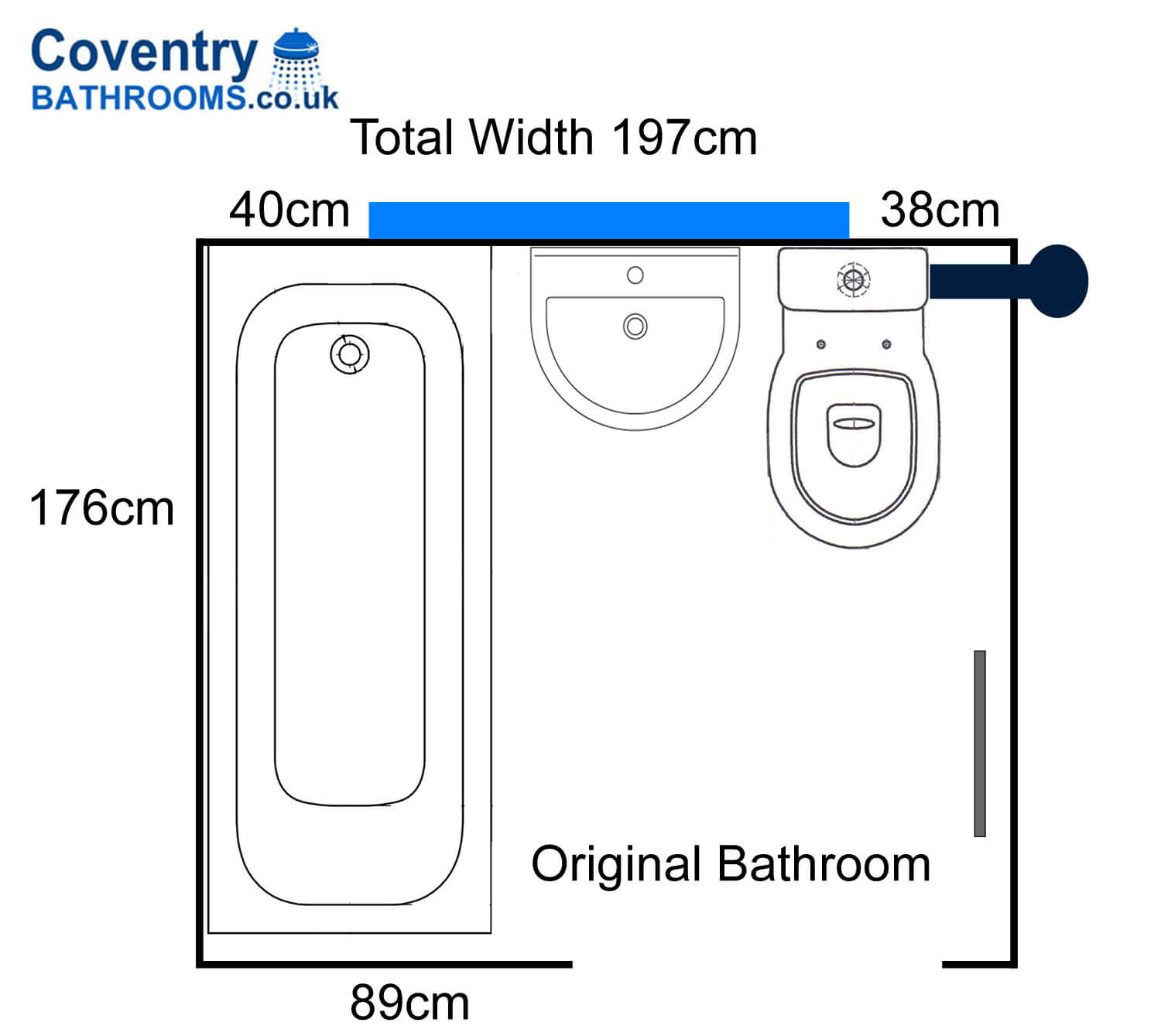 The bathroom measures 176cm by 197cm and is a very typical style bathroom with a standard layout left hand layout. That is to say the bath on the left wall, then left to right the basin and then toilet. Below is a drawing and layout showing the original bathroom.