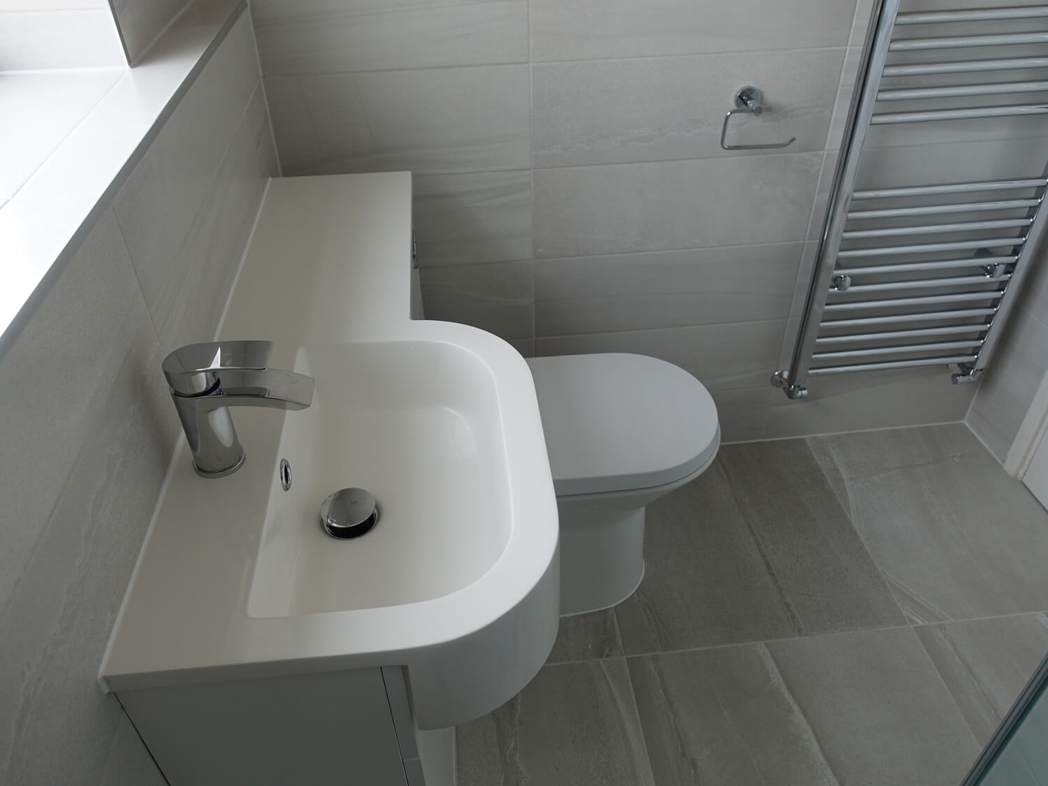 The client requested we remove the bathroom and convert it into a shower room. We were able to offer extra storage with a combined toilet and vanity basin. Below is an image of the bathroom design we have created for the client.